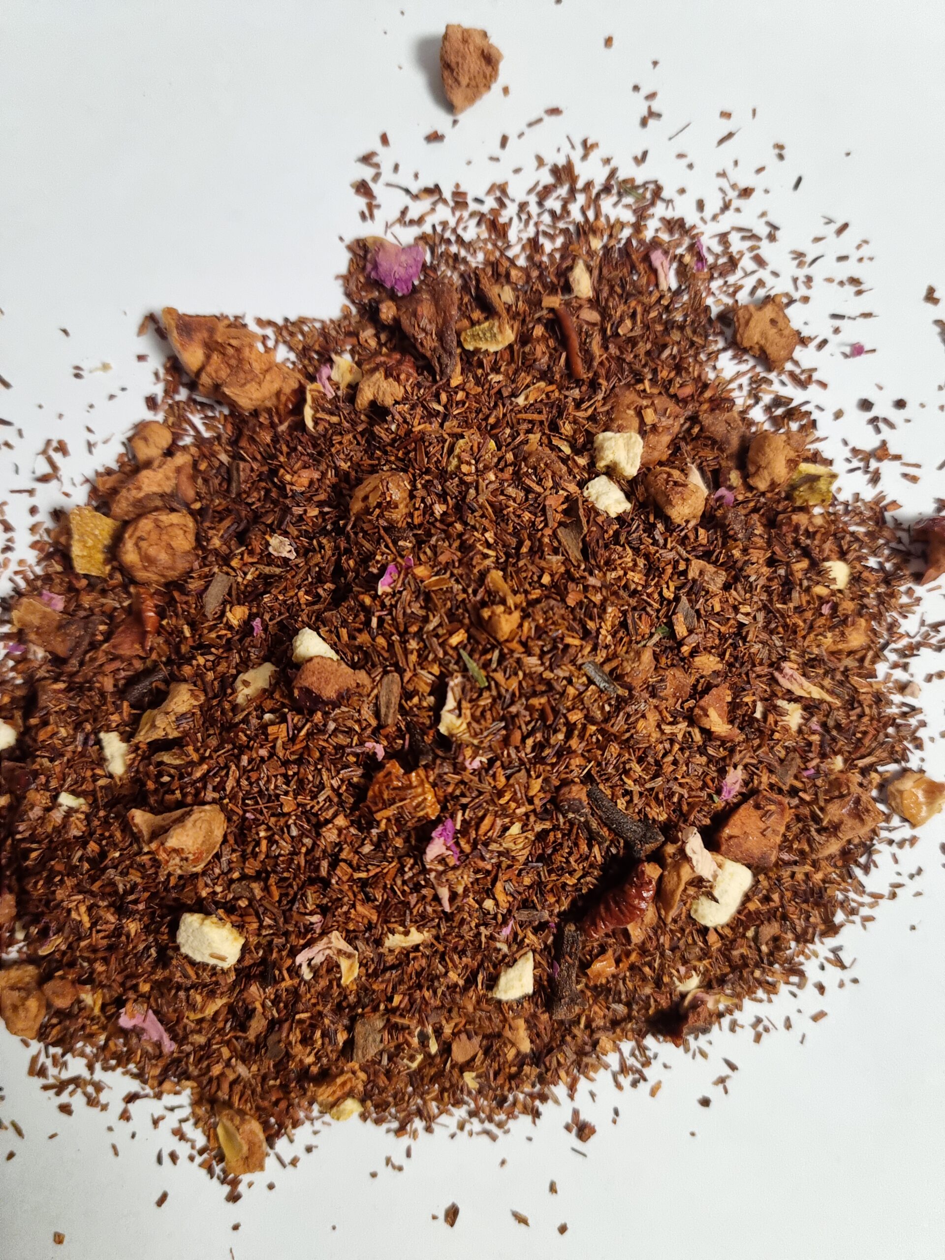 Ingrédients: rooibos*, morceaux de pommes*, écorces d’orange*, bâtons de cannelle*, arôme naturel d’orange, clou de girofle*, arôme naturel de cannelle, pétales de rose*, cardamome*